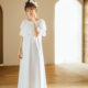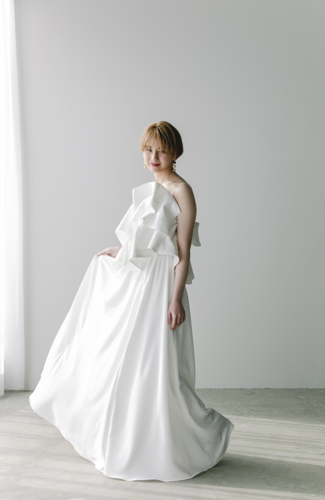 ドレススカートを合わせると、ボリューミーなワンピースドレスのようにもなり、パンツの組み合わせ とはまた違った印象に。