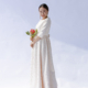 切りっぱなし感が無造作な雰囲気を持ったボリュームのある袖フリルと、ストンとしたスカート部分のメリハリが印象的な ドレス。
